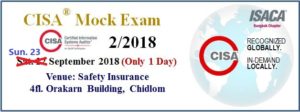 ฟรี (เนื่องในโอกาสครบรอบ 30 ปีของสมาคมฯ) สำหรับผู้สมัครสอบ CISA® และ สมาชิกของ ISACA รับจำนวนจำกัดเพียง 20 ท่าน ผู้สมัครสอบ CISA® ที่เป็นสมาชิก ISACA จะได้รับสิทธิ์ก่อน